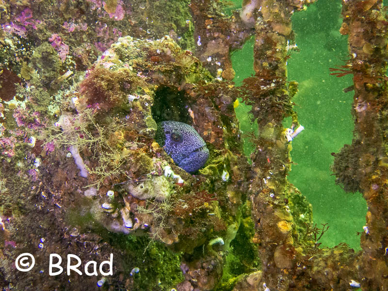 For the first dive, we headed left along the 'wall'. There was a small boat on it's side, still in the sandy area, which had a small wolf eel living in one of the small pipes sticking out. Further along the wall, there is a telephone booth and rocks. A few people saw another wolf eel in one of the cracks by the booth.